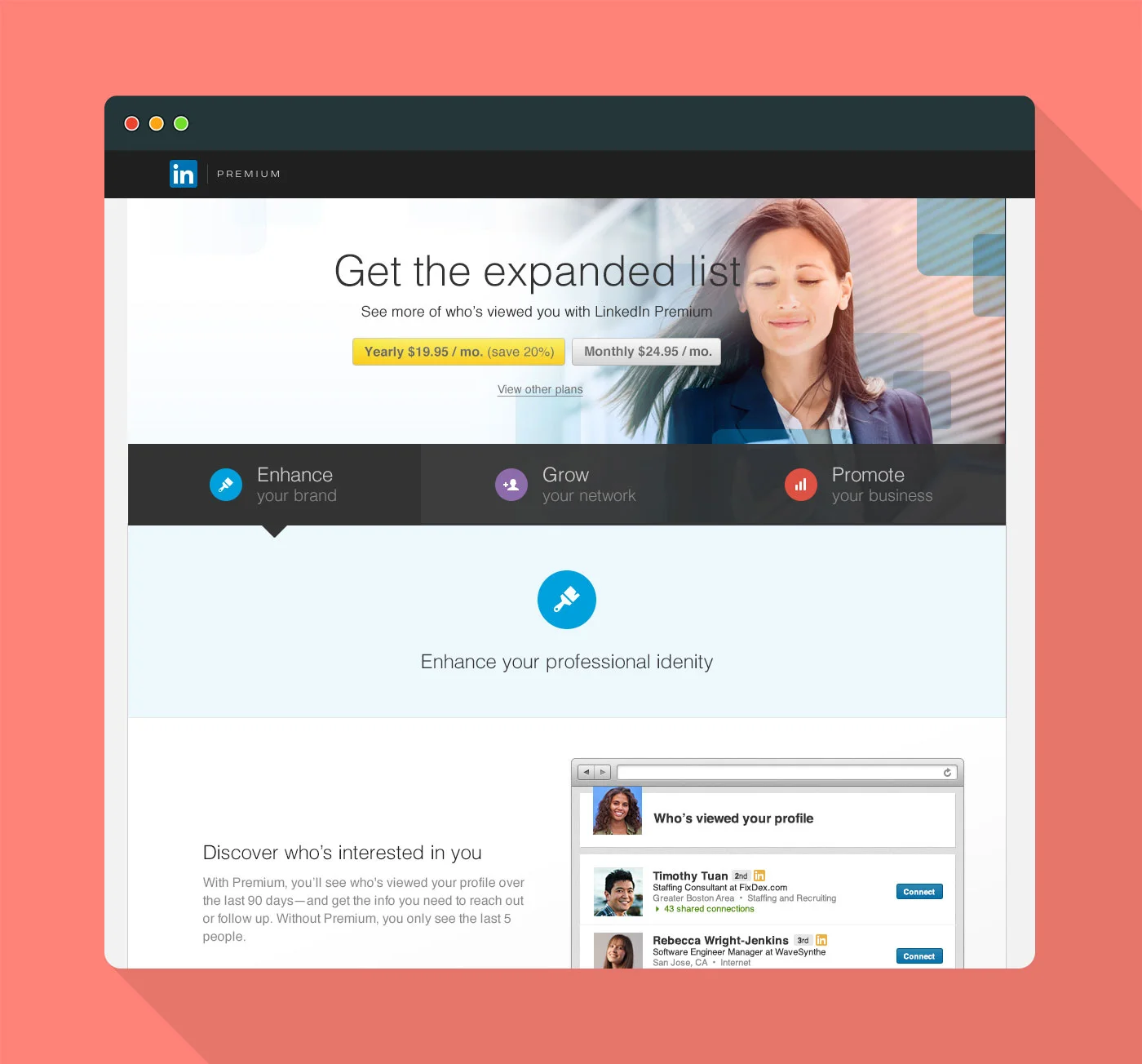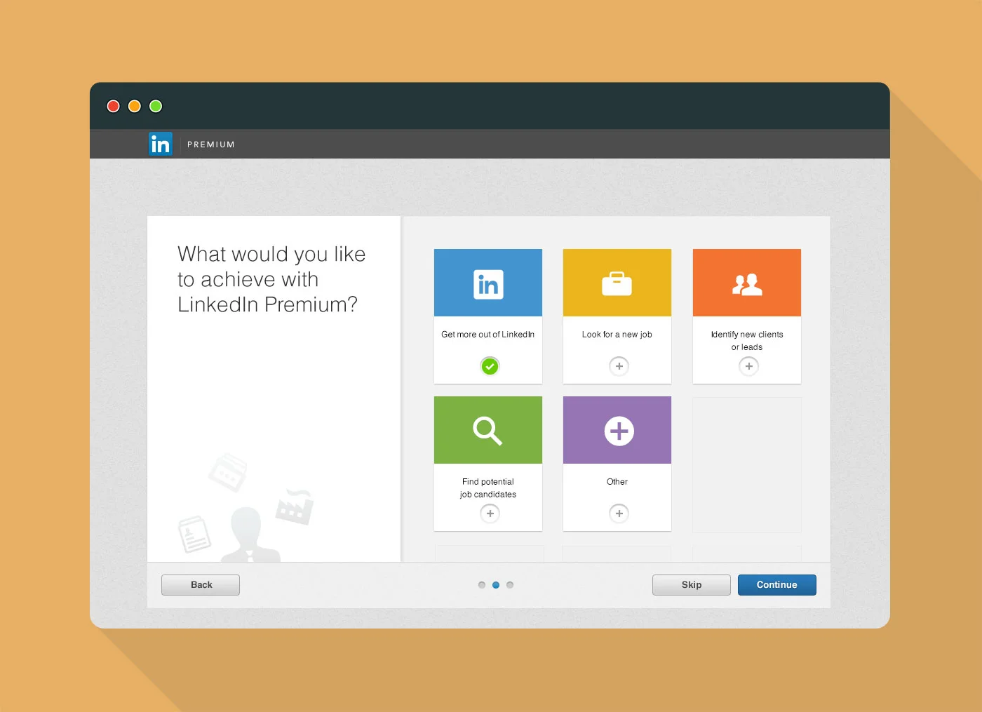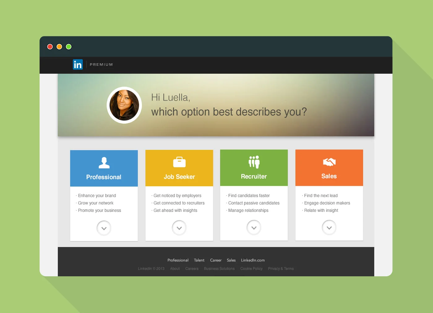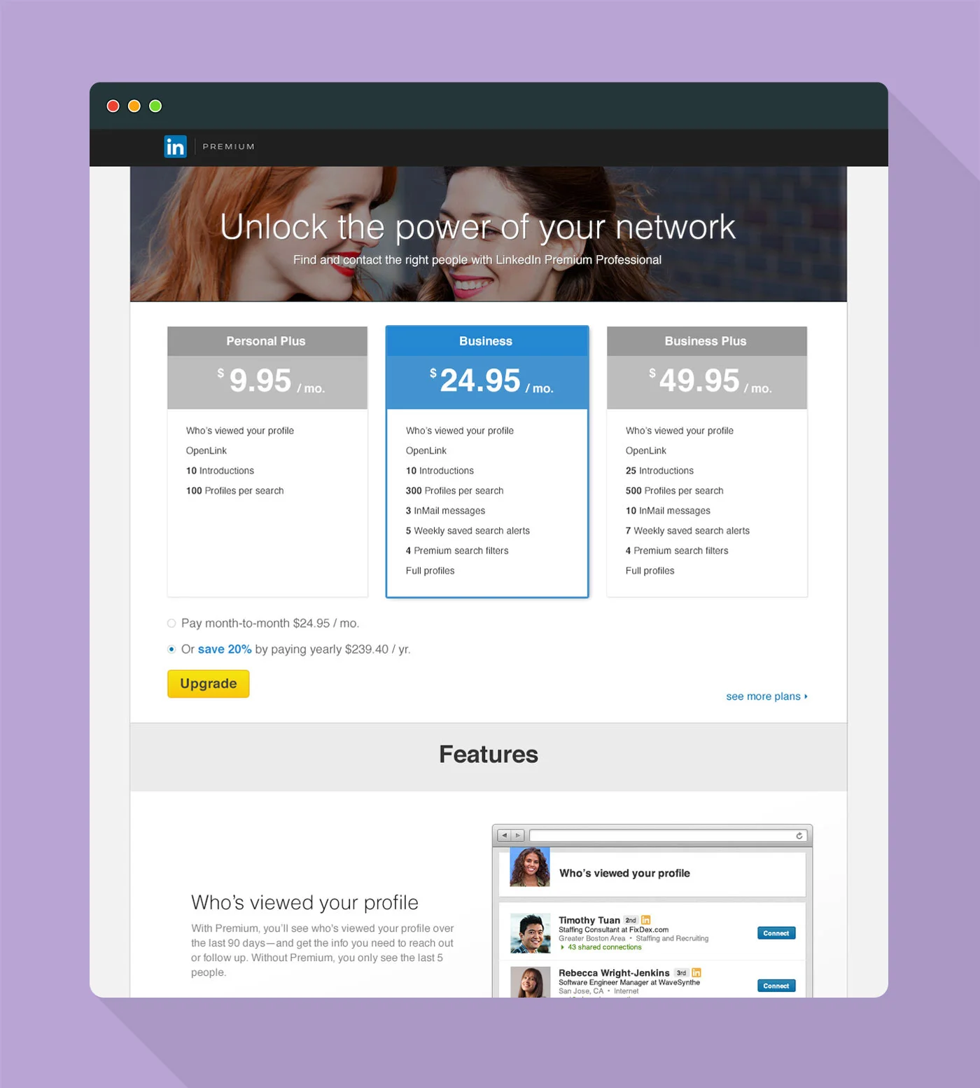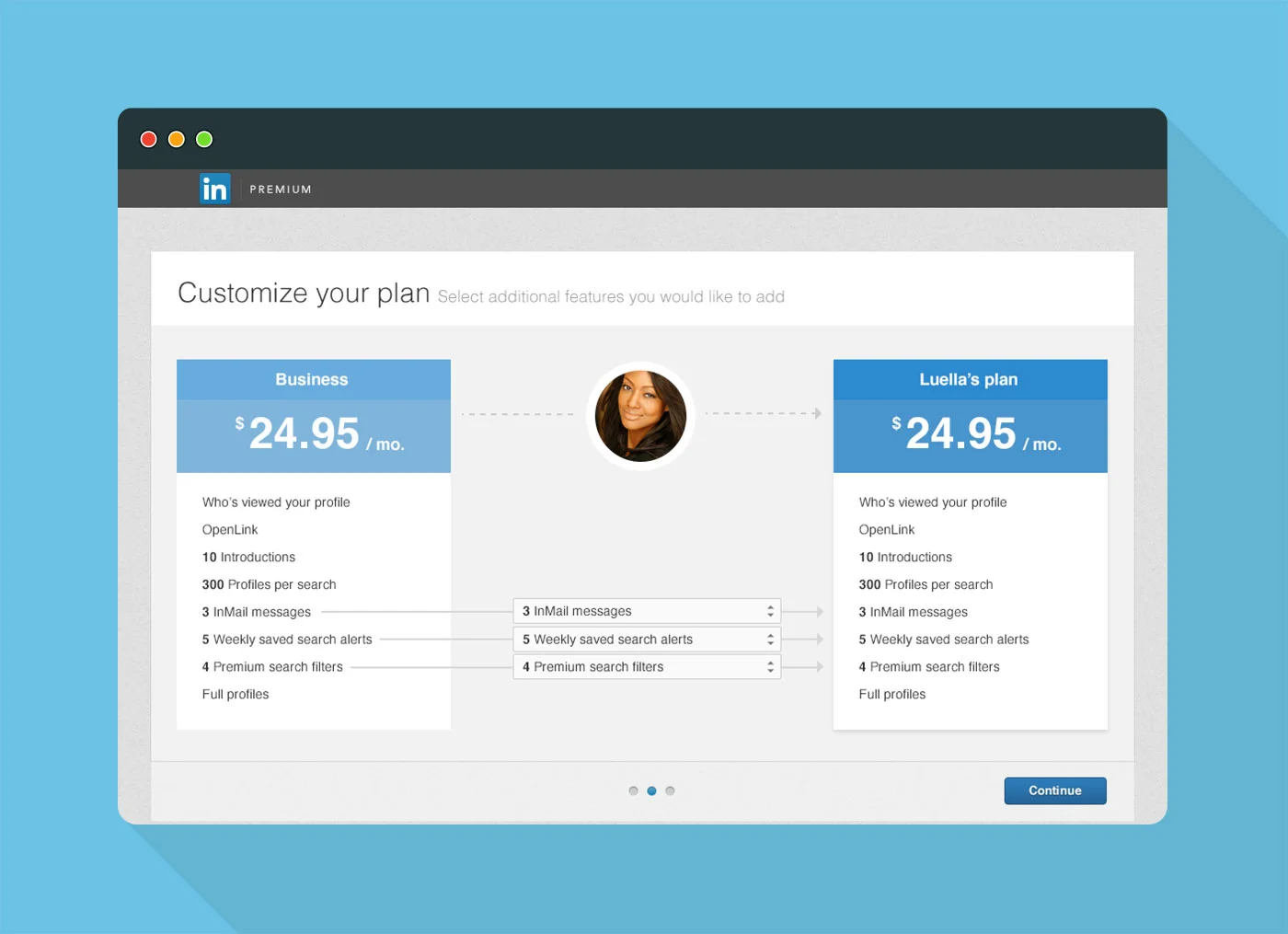 Here, people can build their own experience similar to how people typically buy cars online. They can add features, like Who’s Viewed Your Profile, and different quantities of InMail.