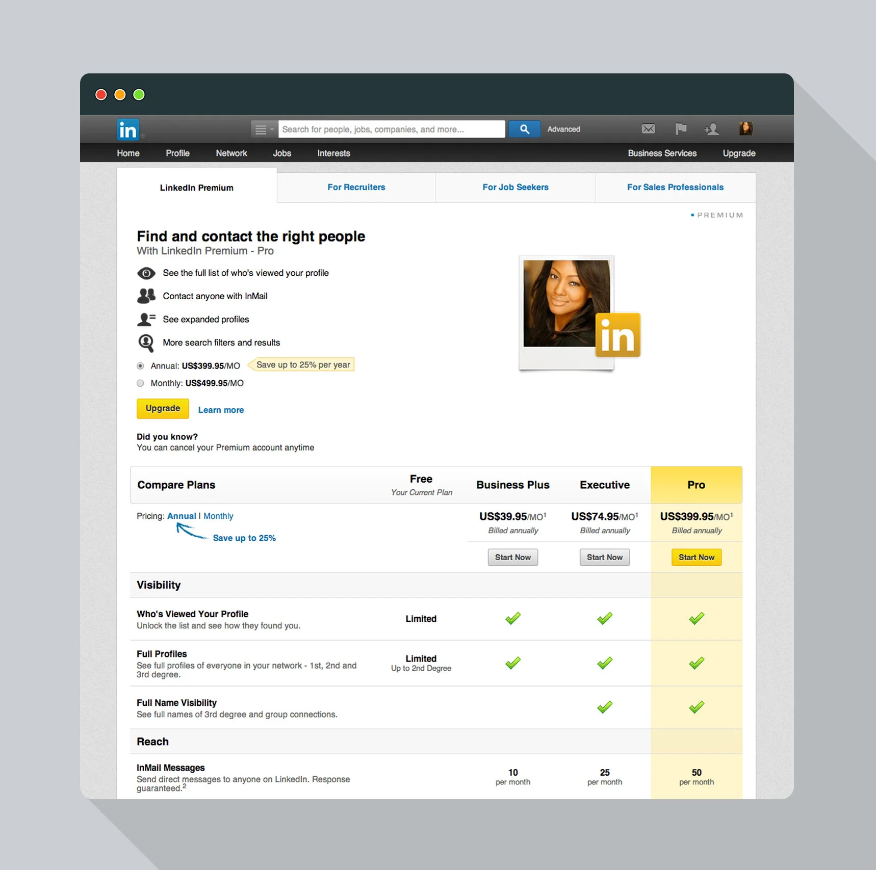 LinkedIn has one of the most complicated Premium business models in the industry. It has 4 different families of Premium packages (Professional, Job Seeker, Recruiter, Sales) with multiple subscriptions for each family, making it a total of 15 types of subscriptions available to our members.