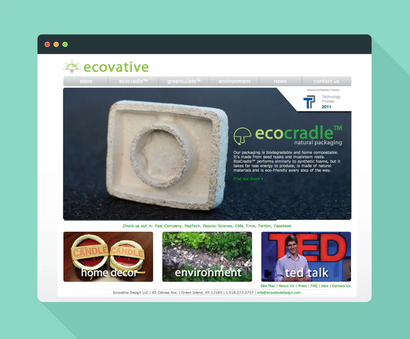 I worked at Ecovative Design, a mushroom materials company, as their Design Director. I designed and made their websites and started a few consumer lines that showcases other potential uses of the material.